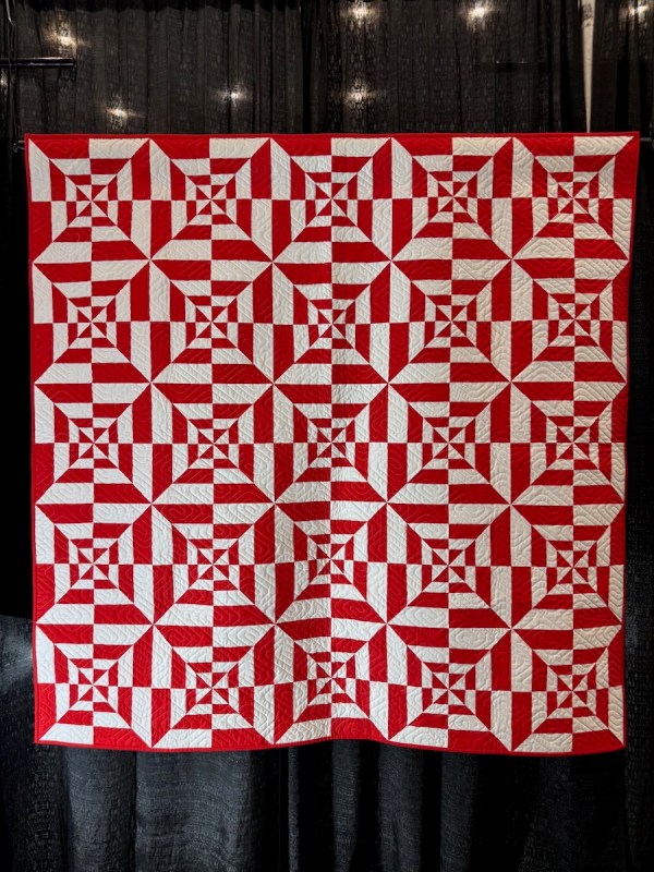 Mercato Square was accepted, and as is the usual with Road, they showed it with all the red and white quilts. (Yes, all the animal quilts are shown together, all the moderns are shown together, and so on. It’s a bit of a visual tic that has been going on for a while, so we just expect it now.) My husband and I went up on Opening Night to see the show, and he was a great help in photographing quilts, and cheering me on (thanks, honey!).