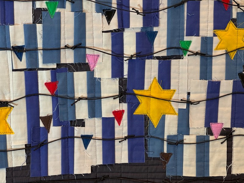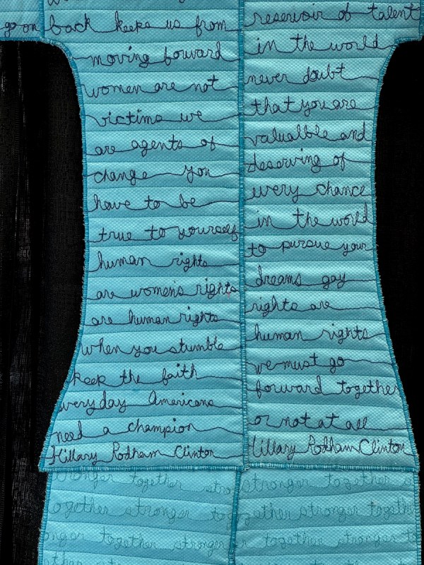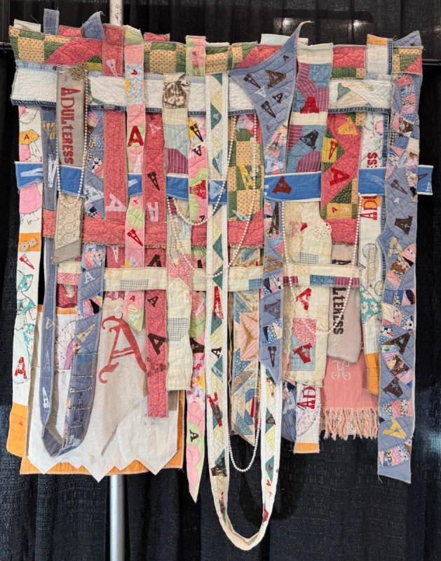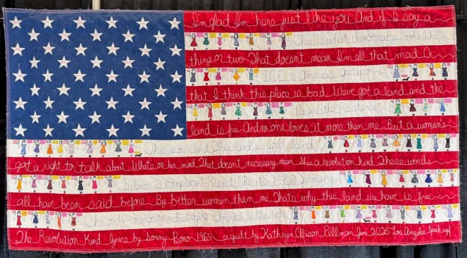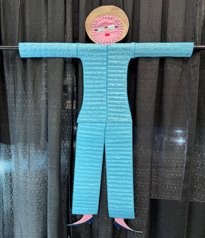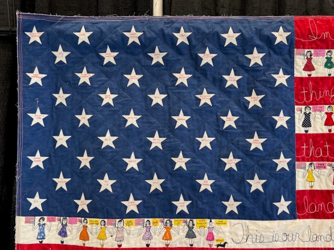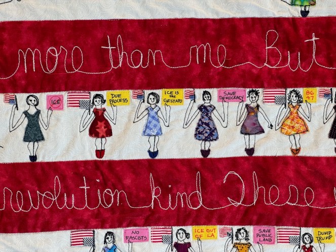 I was interested in the choice to use writing to illustrate some points in these free speech pieces. While Pellman could have gone abstract with shapes and colors and design, the very fact that she’s chosen to use speech dovetails with the subjects of her quilts, and also gives a nod to the idea that freedom of speech is protected in our Constitution, although sadly that weekend, we witnessed the betrayal of that freedom.