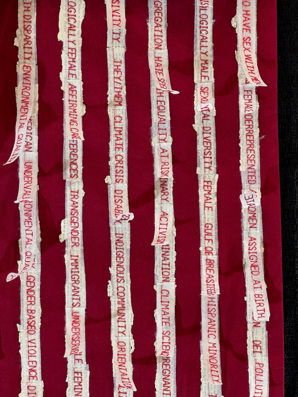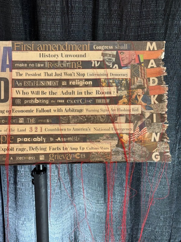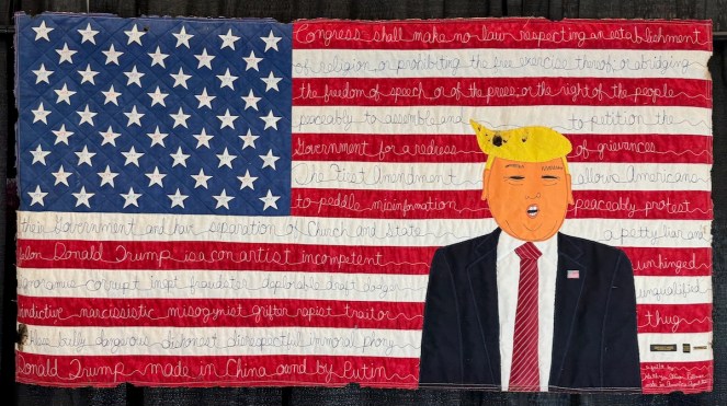Kathryn Pellman writes out the First Amendment to the Constitution on this piece. The title is Donald Trump Made In China Owned by Putin (2025).