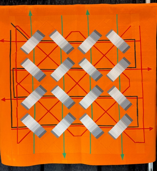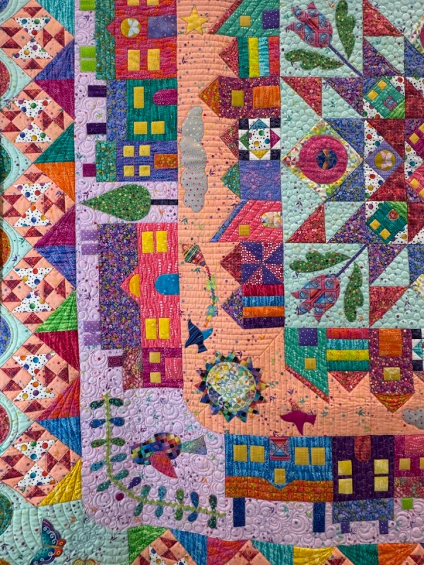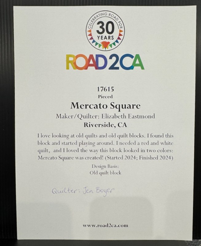 They omitted the quilter’s name on Mercato Square, so I wrote it on: Jen Boyer. The original posts about these quilts can be found here and here.