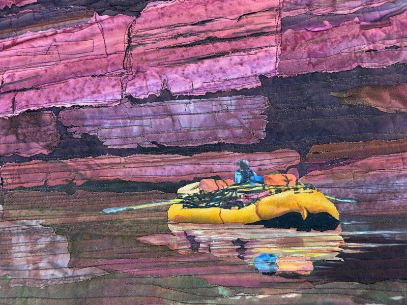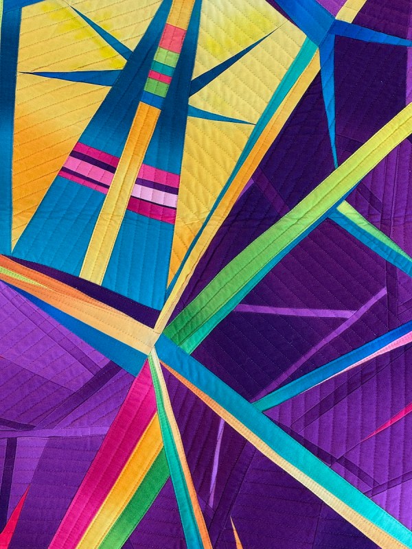 They had lights underneath the quilts, so the value on this is slightly changed: the entire quilt was in saturated hues. Don’t miss that log on the lower edge!