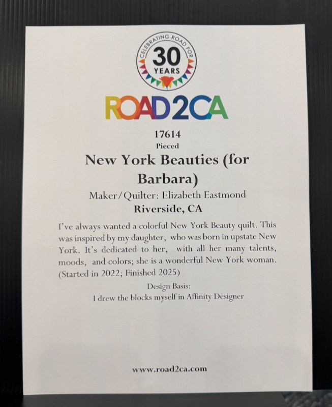 The second quilt accepted was New York Beauties — for Barbara.
