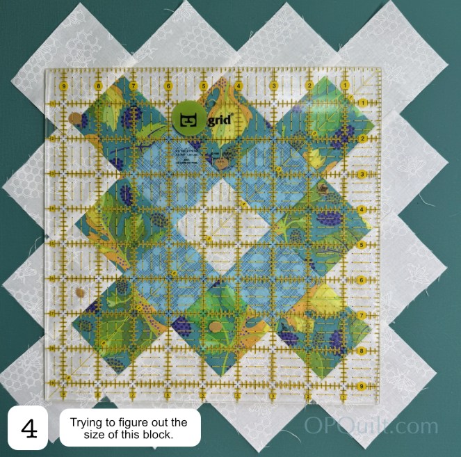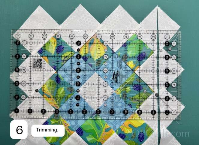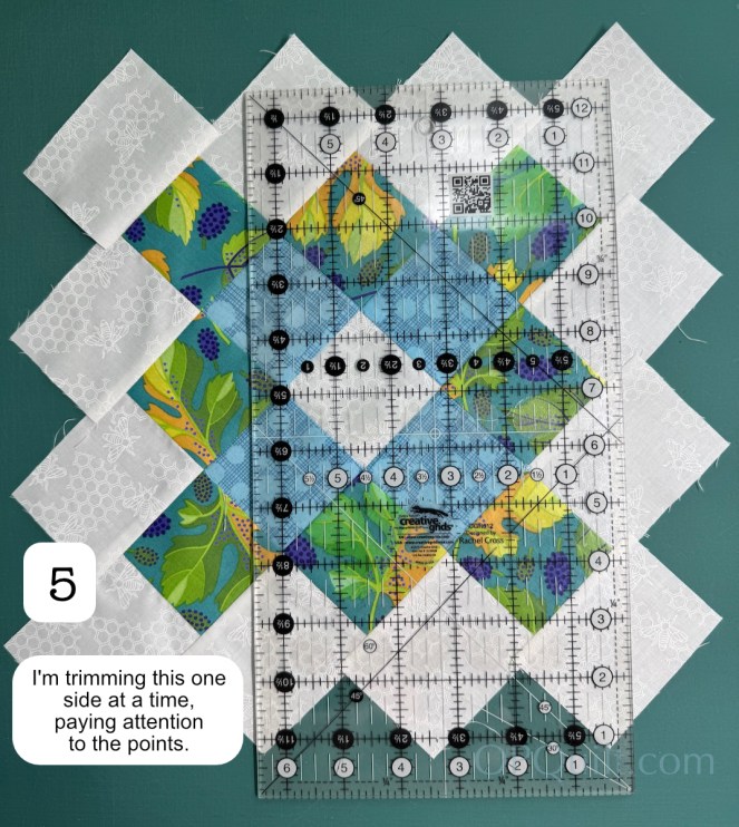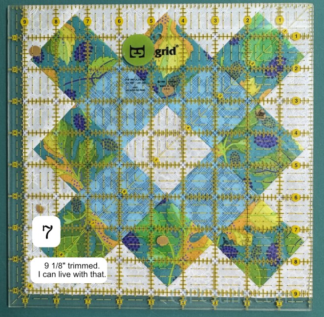 I did Yvonne’s trick (aptly her blog name is Quilting Jet Girl). When she slices the quarter-square triangles again, she carefully aligns the ruler with the seam to get a perfect perpendicular slice at that point. I followed this tutorial, a link courtesy of Carol, but there are many hourglass tutorials out there. After seeing Carol’s rendition of this quilt, I purchased a digital version of the pattern here.