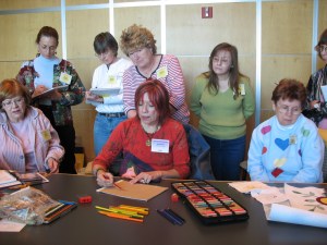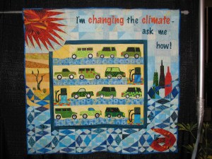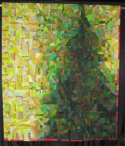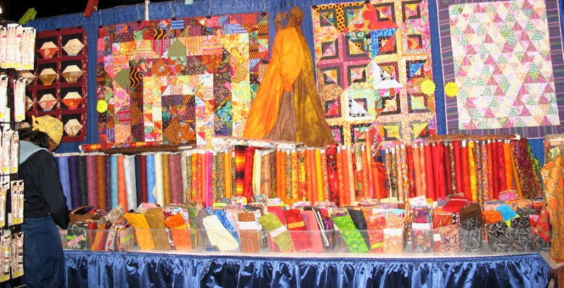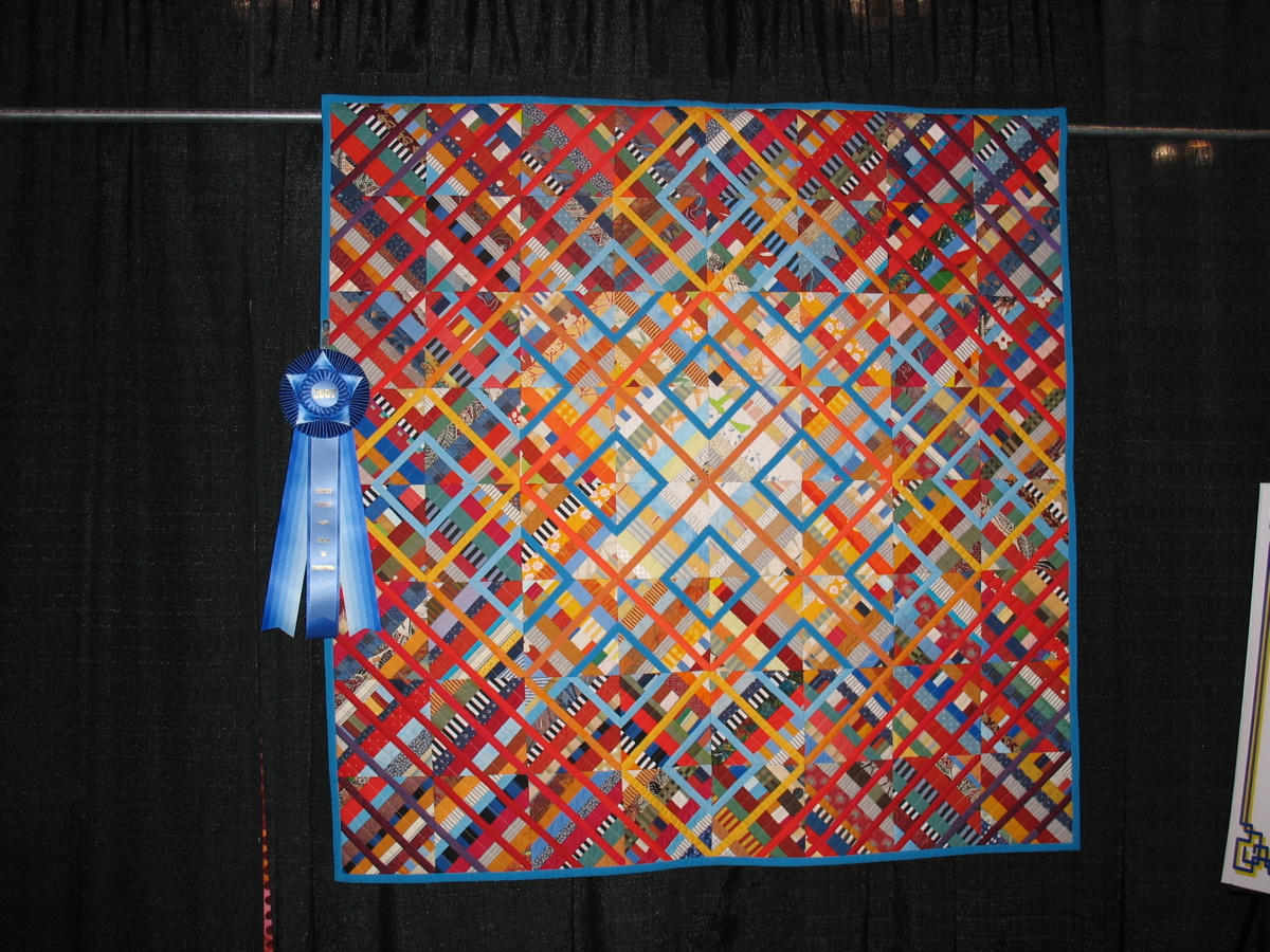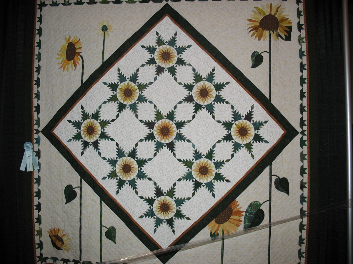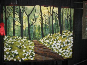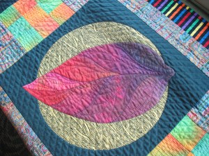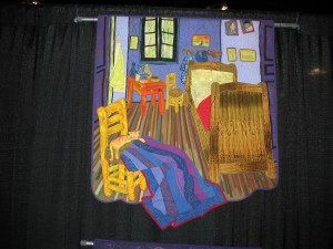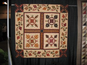 This is a quilt of the teacher’s, an appliqued leaf with shading produced not only by the choice of fabric, but by application of highlights and darks through pencil/crayon media. I expected to enjoy the class, but I was pleasantly surprised by how much. I learned techniques that I know I will use, and my class samples (though hideous) are good examples of what I learned. I purchased more oil-based paint sticks at the show, as well as set of oil-based crayons at Office Max afterwards. Now to find the time.