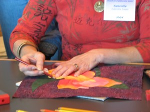 Last week I attended Road to California, a quilting conference with exhibits, vendors and classes. I took a class from Gabrielle Swain, an applique-er who uses paint crayons, and watercolor pencils to shade and enhance her work. Below are some shots of the class.