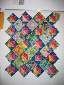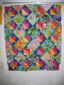 Attempt #2–I was auditioning the orange zinnia-looking print in the outside triangle on the upper right, but it’s gone now. I’m off to rake the leaves off the patio (a spring-time chore in Southern California) while the riot of colors and patterns percolate.I came home tired, but energized–a nice break from slogging through my teaching lesson plans. School started–a good group of students. Time for one last piecing session before the first set of papers comes in next Wednesday (life as I knew it, will be over).