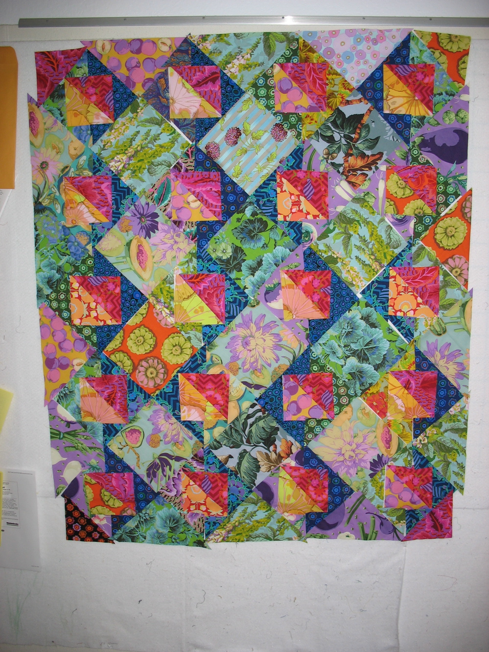 Kaffe Fasset fabrics were everywhere in the vendors’ booths. Seems to be the rage of the age. So I bought some, and the owner (Leo9) let me photograph the riot of colors. I cut and pieced some last night–here’s attempt #1 up on the pinwall.