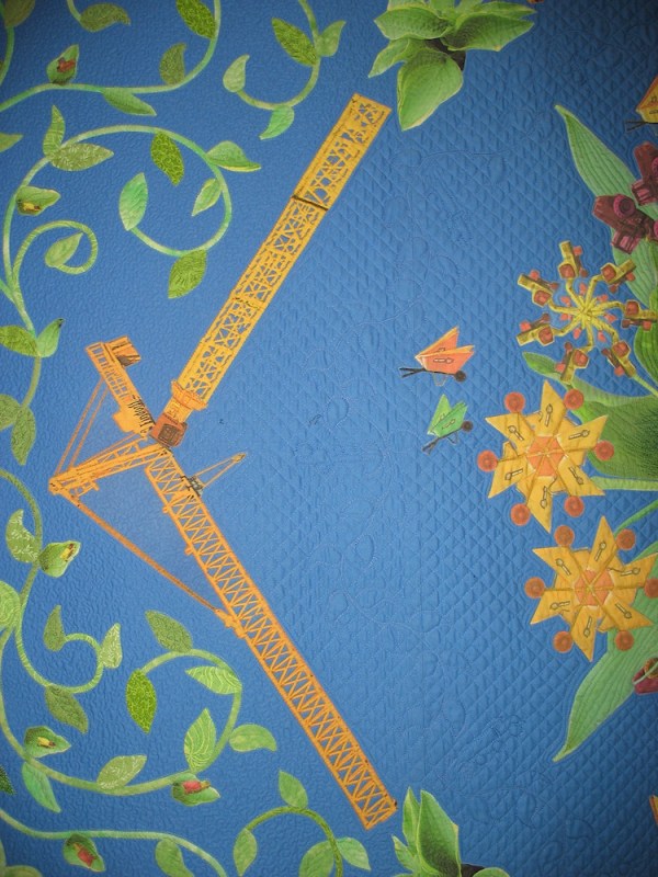 Very humorous quilt. Look closely at the elements in this traditional-looking applique medallion (details below). She used monofilament to appliqué these trucks, but only on very close inspection was it noticeable.