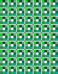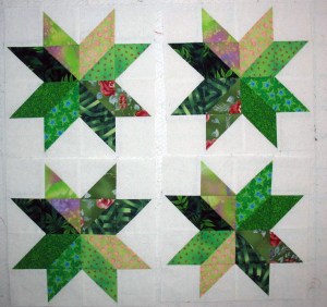 Last Sunday I pieced 4 blocks for my friend’s humanitarian quilt project. I cut out 3 1/2″ squares of green fabric, layered two together and stitched two diagonal lines, 1/2″ apart. I cut the square apart between the stitched lines making what’s known in the trade as “half-square triangles.” Here are the squares above.