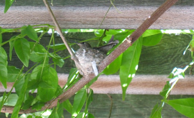 So here’s a change of subject. In our arbor out back, where some of the vines have looped down underneath, a hummingbird has built her nest. She’s about 8 feet from our family room window and we brought down the binoculars to watch her up close. My grandchildren Riley and Keagan had a fun time seeing her on the nest (although the functional use of the binoculars was a bit out of reach for them). That bird just stayed there and stayed there and stayed there.