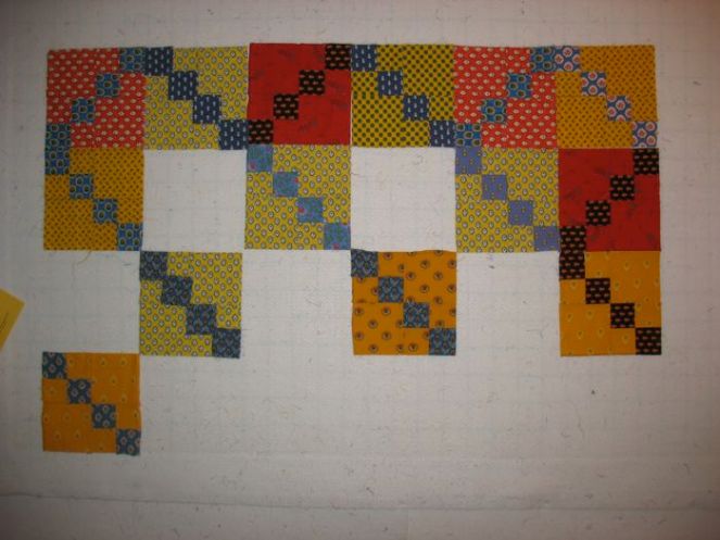 I still like the idea of the zig-zaggy borders being incorporated into the quilt, so that it contains its own border. So I’m kind of hanging onto that idea for now, knowing that whatever I put in the middle with have that as its outer edges. I decided that the color combination of the blue-gray against the yellow (which I personally love) is part of the problem, so in the quilt above, I’ve covered up some of that blue gray with a deeper contrasting blue, helping the little squares to march across the quilt in a diagonal pattern. I wonder if I should bring in a solid, to help balance the “dottiness.”