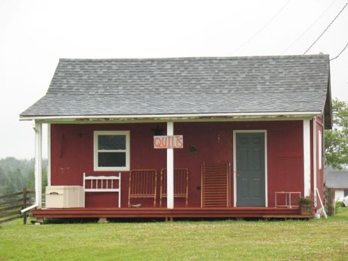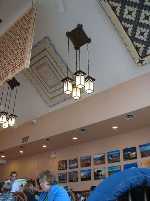 On our way to the Anne of Green Gables House, we stopped for lunch at the Prince Edward Island Preserve Company and there were quilts hanging from the ceiling. I was pretty amazed because around here, nobody does this. It was the first taste of the frequency with which I would see quilts advertised, either in quilt shops, or in gift shops, or just a lone sign tacked to a front porch: Quilts.