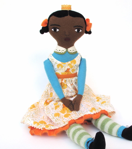 One of those artists is Mimi Kirchner, who I’ve written about before, but to be sure, I can’t find the post. I found her some time ago, and was fascinated by her “art history,” as she calls it, when her pottery studio burned to the ground and she went a completely different direction. This morning’s post showed this new doll of hers all done up in a Heather Ross double gauze pinafore, striped stockings, turquoise shirt and a little wee crown, for she is the Frog Princess. Mimi knows just how to combine the usual with the unusual that always makes studying her dolls an adventure and a lesson in creativity.