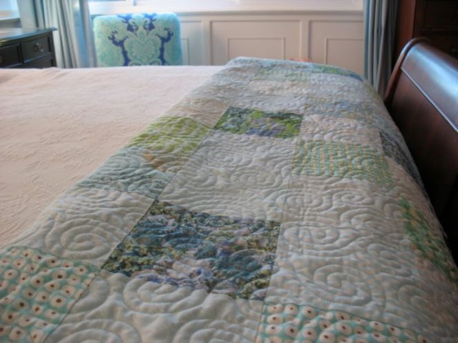I began buying the fabric for this quilt about three years ago, picking up fat quarters here and there, amassing a collection of blues that would coordinate with those lamps–as they were the first things I bought and my husband will tell you that they pretty much dictated the whole room. One hectic Christmas, my son-in-law painted (we helped), we bought drapes, and this summer I had the little slipper chair redone in some exotic Amy Butler.