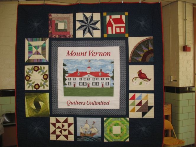 I’m out on the East Coast and one morning. This past Tuesday, I met Rhonda, a friend and quilter from the DC area, for brunch. Afterwards we headed down to my old quilt guild for their first meeting of the year.It’s the Mount Vernon chapter of Quilters Unlimited of Virginia, which is a consortium of 11 different chapters like ours. We’re the smallest, however. Bert G. had written to me last year and asked me for a copy of my photo of Mt. Vernon, which she then used in the centerpiece of a new banner. It was fun to see the completed article. (The other squares were made by other quilters.)
