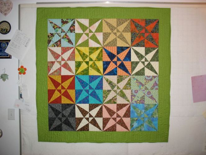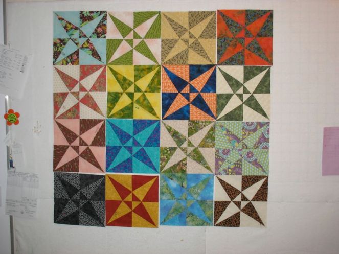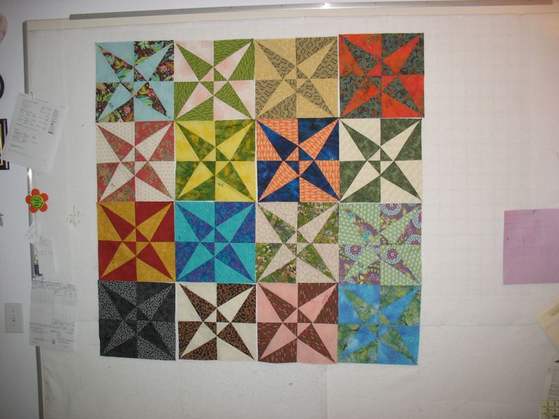 She fast-mailed the quilt to me and it arrived overnight. I put it up on my pin wall, and I have to admit I was discouraged. Really discouraged. I had one more block to add, but all I could do that first day was true up the squares and put them back up on the wall. That actually improved the balance of things, as part of the trouble was that they varied in size, as do all group projects of this kind. I made mine and added it to the mix, but it was still problematic.