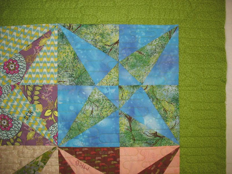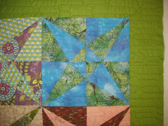 Back from the quilter, I took a photo of my block–it’s right next to the boldly patterned block of my sister’s. I like that we’re together.