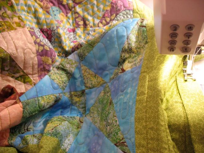 Borders on. I didn’t smooth it down so they look a little wonky, but really, they’re straight. Done with the front, and I stitched together the back, trying to cut it creatively so I would have enough left for the binding. The next morning, I dropped it off at Cathy’s. She had one of mine ready for me, so I asked her if her small machine had anything on it, and if by any chance she could put this one on. I told her the story and added that my sister had called and said she was coming down to Southern California for the weekend–I could give it to her then. Cathy agreed to get it done quickly, and two days later, Thursday, it was done. Like I said, she’s a miracle worker. We chose the quilting pattern titled “Calm Water,” a fitting pattern for these crossed canoes.