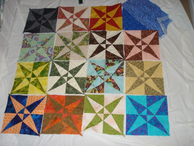 I called my sister. Some changes were allowed. I took apart one block to make it more the size of the others, and did a quilt intervention on two other blocks, substituting fabrics. I moved the blocks around on my wall.