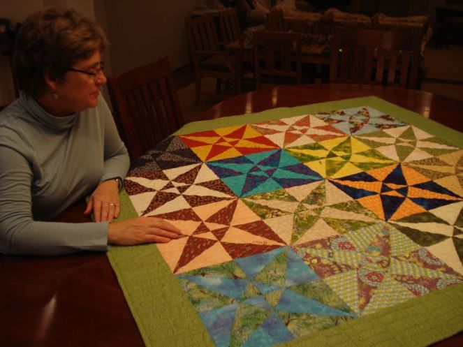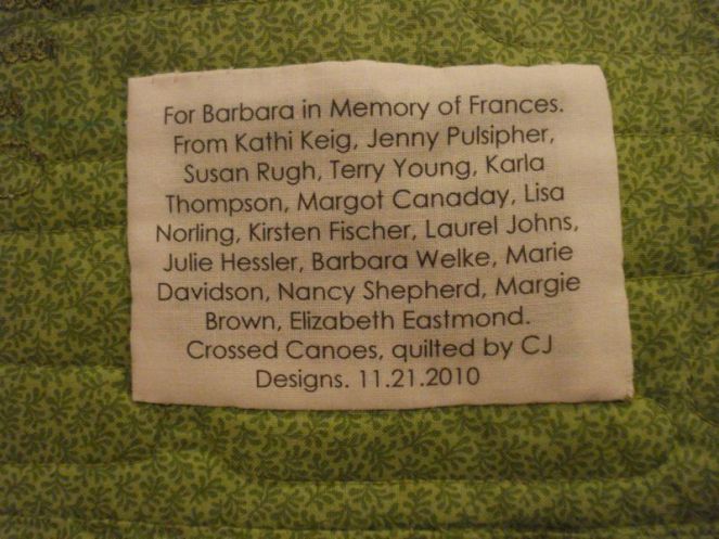 My sister’s friend recently lost her daughter. As a memorial, my sister organized a group of friends to make quilt blocks in the crossed canoe pattern. She laid them out on her floor, called and asked, “Can you help?” Yes. I asked her if she wanted me to get it quilted down here, as she couldn’t even get a quilter to take on the project before Christmas, and she wanted to get it to her friend.
