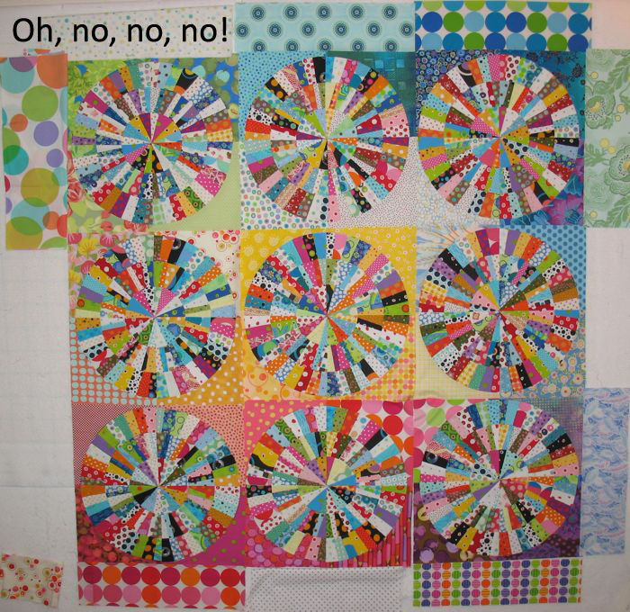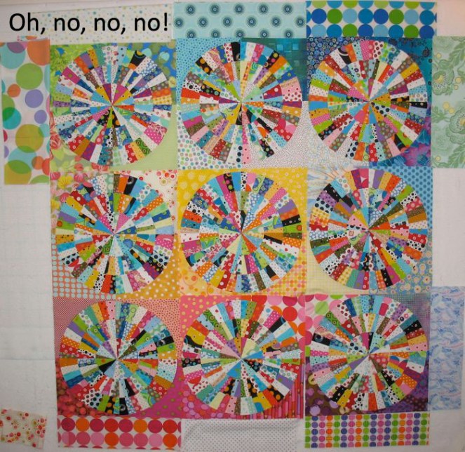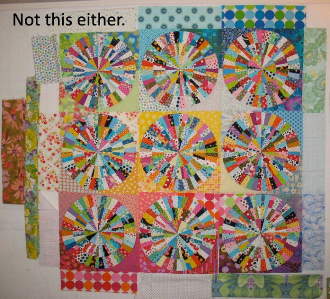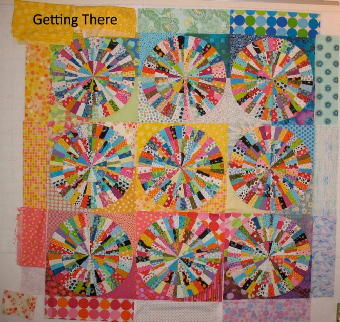 This is what happens when you realize that you’ve cut the piece 16″ and it should have been 16 1/2″. You piece it. With whatever scraps you have. Even though you are creating a new kind of fabric with a two-toned dot.