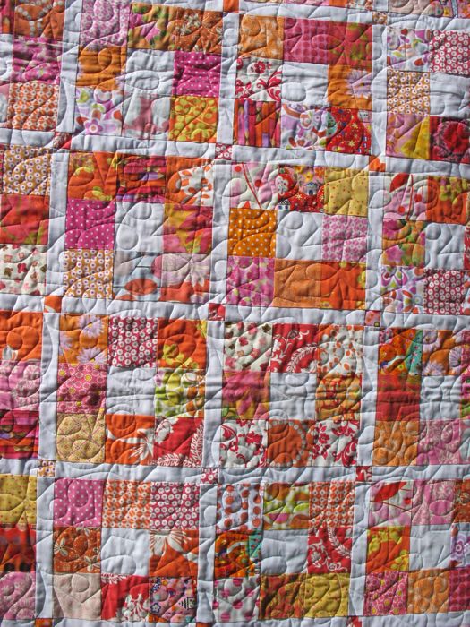 Cara Cara is a type of sweet navel orange that has pinky flesh, and is an early navel variety.  Kumquats are a small sour orange fruit that you pop in your mouth and eat–skin and all–and although it makes your face pucker up when you first bite into it, it leaves your mouth feeling really fresh.  I pull one off our trees out front when I’m going somewhere as it freshens my breath.  Add them together and you get the name of my latest quilt: that pinky-orange 9-patch that I’ve been working on for a while.
