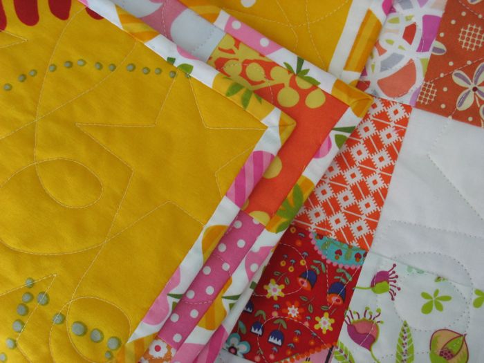 The back is pieced, and is a Marimekko fabric from Crate and Barrel’s Outlet Store (which regretfully moved 90 minutes away from my house–how I am supposed to get my quilt backs now?).  This is supposed to be stylized fruits (see the grapes?) but sometimes I wonder if the people in Sweden have different fruit than we do.  Let’s be real: I chose it for the colors.