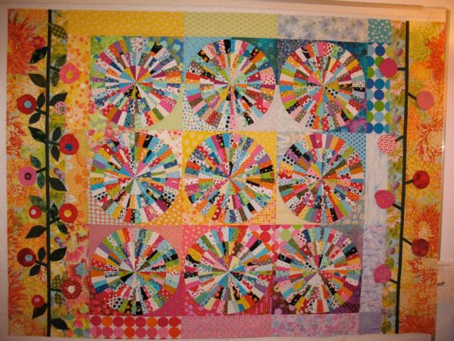 Those tiny circles are tedious, but the forward motion of the quilt is pulling me to completion.  Will I last for the next few weeks?  I’ve got a commitment to Rhonda to start our Lollypop blocks in March, but Rhonda, please–can I have a little more time?