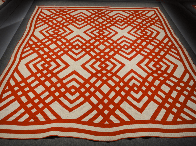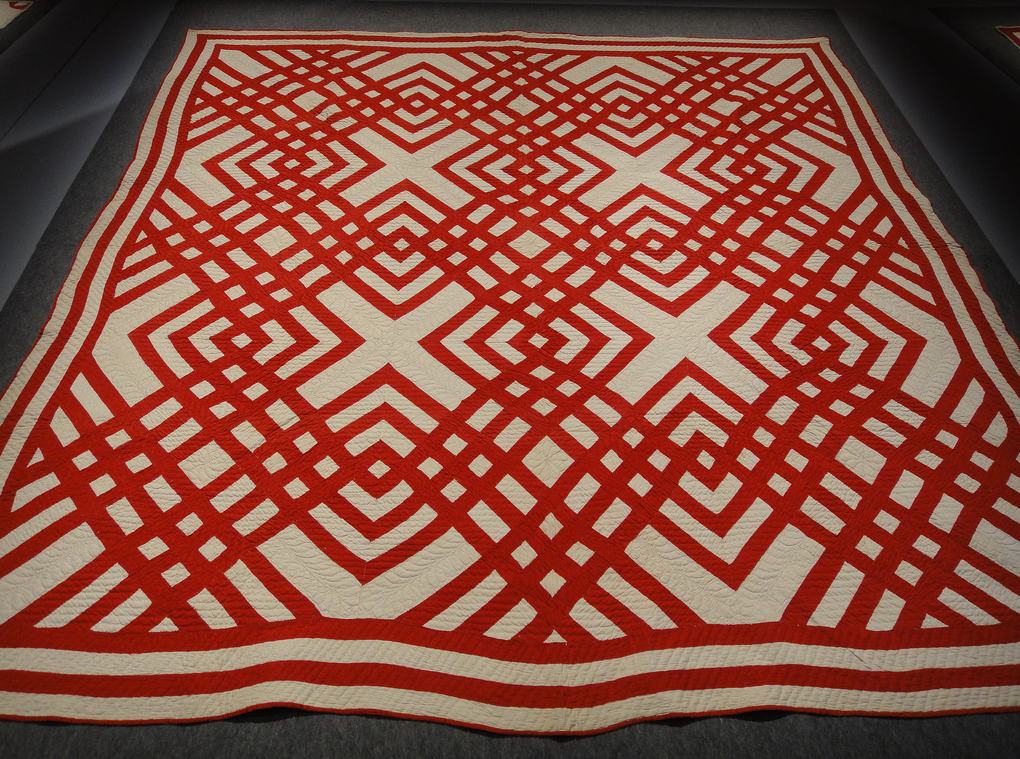 Apparently there is an incredible exhibit of red and white quilts.  Judging from this photo it might give the viewer a sense of having tumbled down the rabbit hole and is now gazing upon a whole pack of playing cards, all arranged into circular forms.  From the website:
