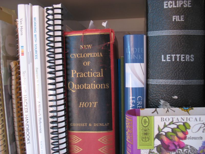 Yes. Hoyt’s New Cyclopedia of Practical Quotations. This edition was compiled by Kate Louise Roberts, and if the cracked spine and archaic title didn’t give away its age, certainly the editor’s full name did. Originally published in 1922, the edition I have is the 1940 edition, purchased at an estate sale when I first moved here. I’m a sucker for pithy little lines of verse, beautifully written epigraphs, quotable quotes, and terrific sayings from people, both famous and not. I think I inherited this from my father, who, even in his 85th year, still can find a quotable line for almost every situation–and he recites them from memory. However, I look them up.