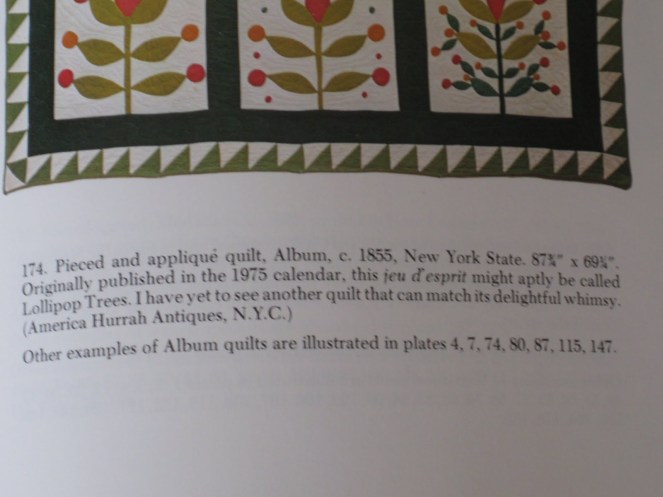 This is a published picture of the quilt, circa 1855 from New York State. In the notes they allude to the quilt looking like “Lollipop Trees.” But McLean’s quilt is titled Lollypop Trees, a different spelling. The original is basically done in three colors: an olive green, turkey red and deep green, and a zig-zag border.