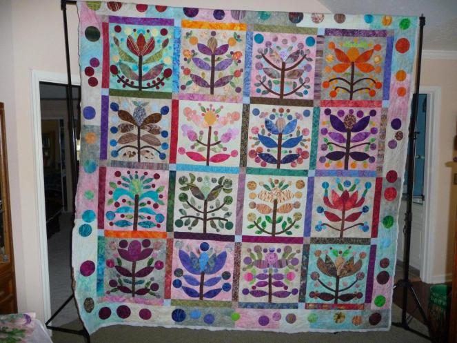 Beautiful work! I really like the smaller version with the large circles in the border. I am currently making this quilt. Lots of work, but so exciting. I am not putting quite as many circles on some of the blocks, and I am not going to do all those little applique blocks in the border. Thanks for your pictures. Inspirational to know someone else is as adventursome(read Crazy) as I am!!