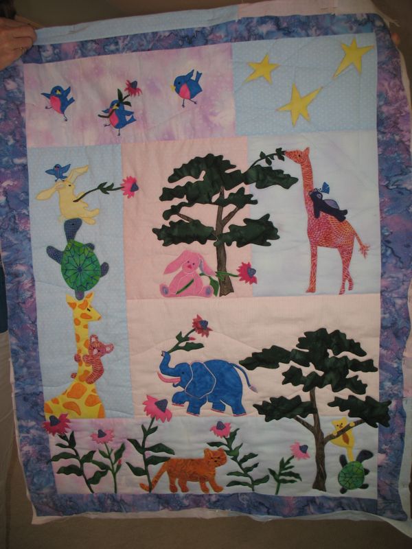 This is Connie’s quilt for a friend–all done with machine applique (a lovely line of zig-zag stitching around everything). Connie said she chose a quick pattern this time for a quilt, and Lisa and I burst out laughing. You ought to see Connie’s complicated quilts!