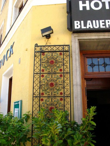 Five years later, we went back to Munich, and this time I didn’t erase all my photos (back it up, people, back them ALL up!). I didn’t ever find the original gate, but I did see this grillwork alongside a building near the dirndl shop, near the beer garden downtown, with the same central motif. It felt like I was seeing an old friend.