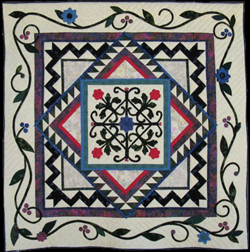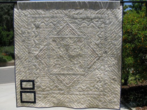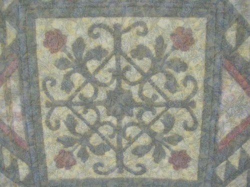 Here’s the central medallion, almost finished. Then the hard work of figuring out the borders–always a dance. I invested in a couple of used books, and slowly, border by border, I built the quilt. We were on sabbatical in Washington, DC at the time, and I was able to finish my quilt top before we left to return home; I quilted the top all the way across America, finding more thread in Albuquerque when I ran out.