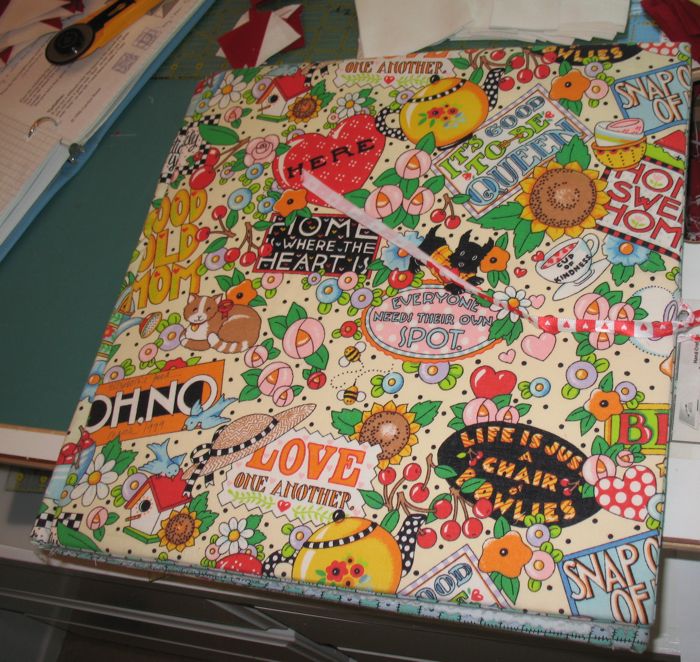 Stitch down the middle. Create a pillowcase-type shape a little larger than your pages, and insert one foam-core art board cut to size in the bottom. Stitch along the edge, then stitch about an inch away again, then insert the second board. Whipstitch closed. Layer everything and stitch down through the middle to secure the pages. Of course, I did it a much harder way–cutting all the pages individually, then enclosing them in the binding, but it was the first time, and I was finding my way through this. I also have ribbons on it, so I can tie this up and transport it, which I have done to quilt classes, etc. I’ve seen the use of foam-core art boards, stacked up in use at home, but I like this design because it is less bulky.