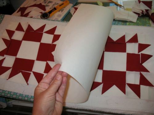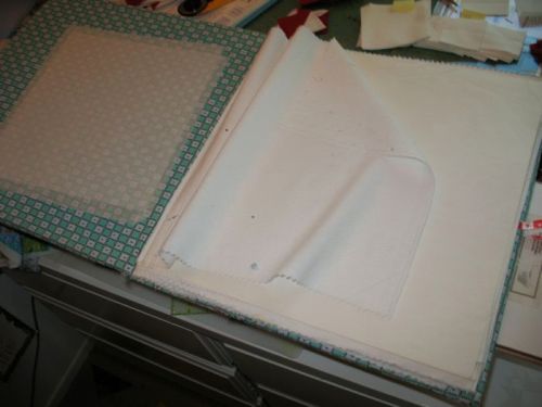 I use a quilting book to help me lay out the blocks, since they have a lot of pieces. I made it from cloth, foam-core art boards, flannel and butcher paper. I cut those into long oblongs (two-page size length and one-page size width; my pages are about 14″ square), layering the flannel with the butcher paper.