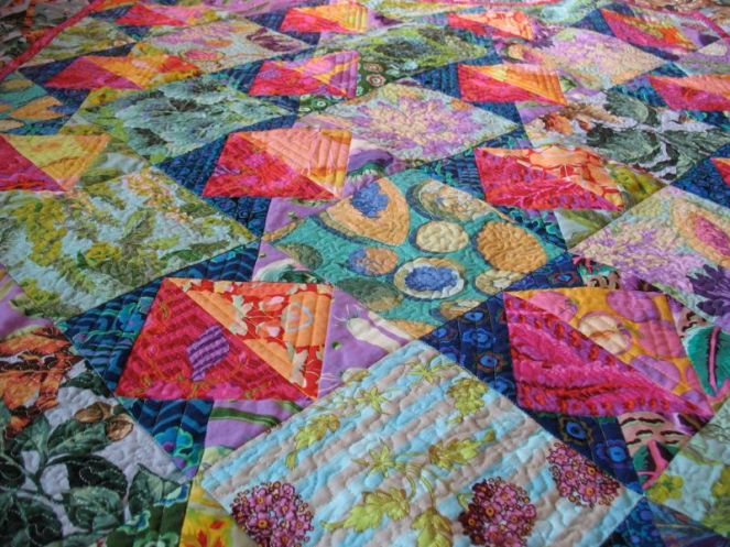 I spent most of yesterday–the Fourth of July quilting. Pedal-to-the-metal type quilting. Red-Pepper-Quilts-type quilting. But first, I put in two tomato plants, some basil and some herbs. That’s pretty funny to do it on the hottest day of the year, a full six weeks behind schedule. But that’s because I vowed No Garden this year, given our usual crop of $60 tomatoes, an old joke on how much it costs to do home gardening. The possum and raccoons are kind of ticked off at me for closing the kitchen this year, tipping over pots on the patio in search of the usual canteen. So we tilled the soil a couple of days back and amended it today with Miracle Gro (I need some stuff called Miracle Quilt, as does the granny in the cartoon) and little green plants are wilting and wavering in the hot breeze. I’m calling this a preparation-for-winter garden, with some summer enhancements.