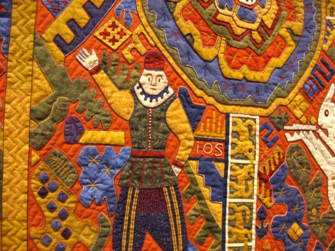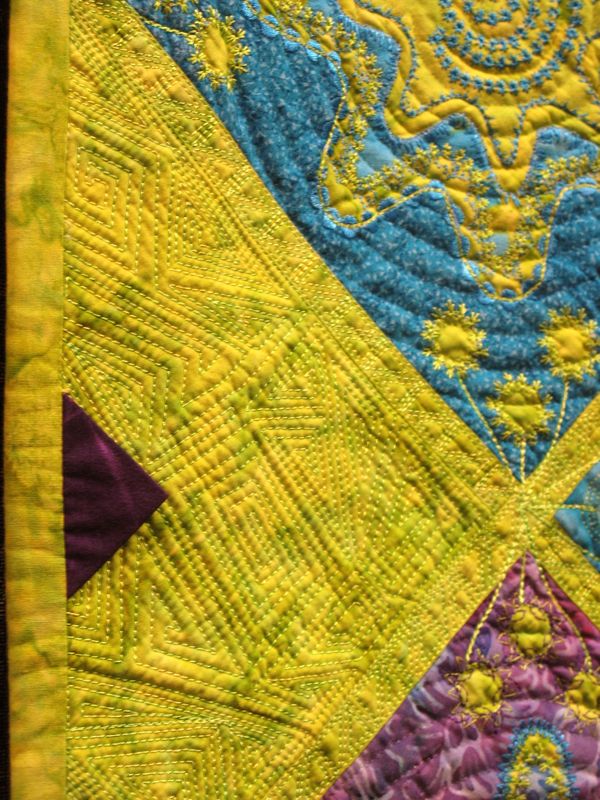 I remember listening to an elderly speaker once who held up a three page letter someone had written him, all done on the computer.  He made some reference to if it were written by hand, the wandering prose might have been reigned in and the letter’s author might have gotten to the point more quickly. I sometimes wonder if we don’t suffer from the same sort of lack of editing with our swift and powerful machines these days.  I can admire a heavily stitched quilt and can emulate what I can on my smaller, regular machine, in order to get my quilts made.  But when I look at what Suzanne Marshall has done on her quilt (below), The Legend of Guimar, I often wonder if we might need to reign it in a bit.