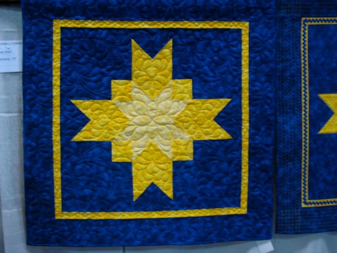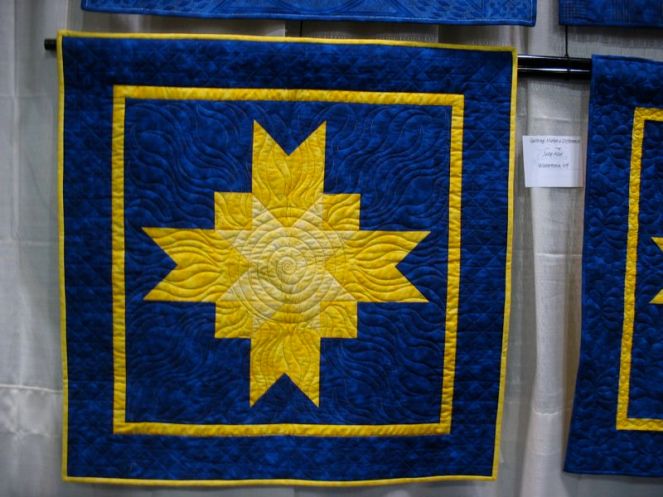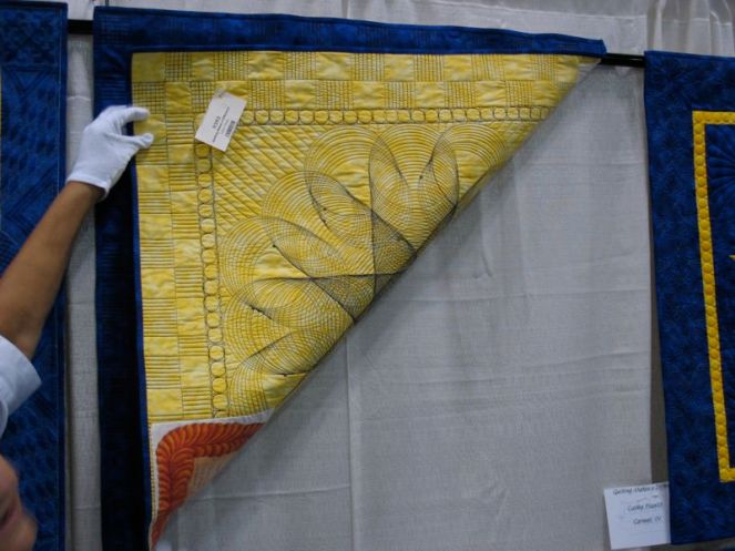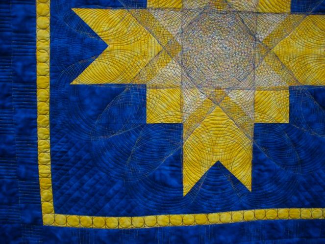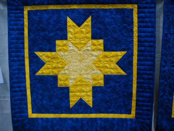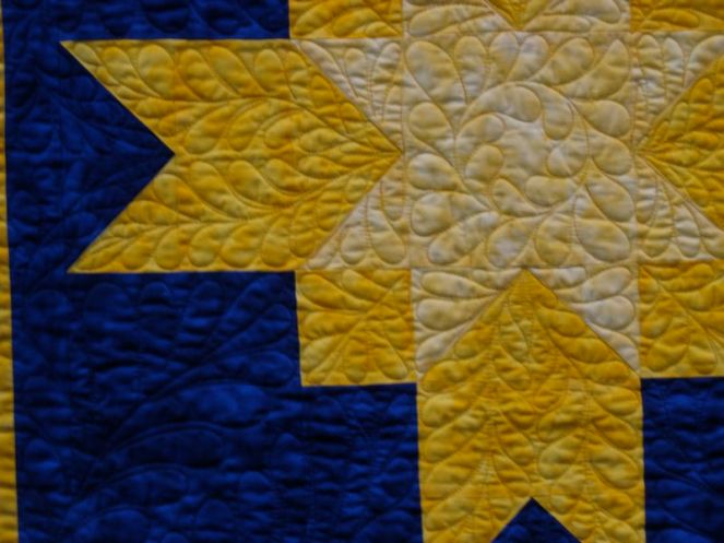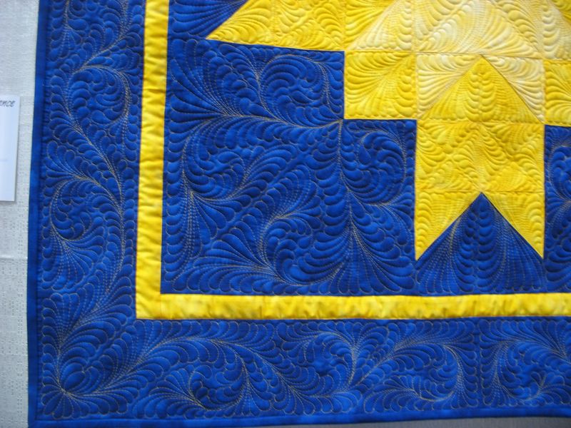 The lighting was bad on this side of the hall unless a flash was used.  But then the quilting would have been blanked out by the light, so hope you don’t mind the slightly blurry (but can see the quilting) photo.