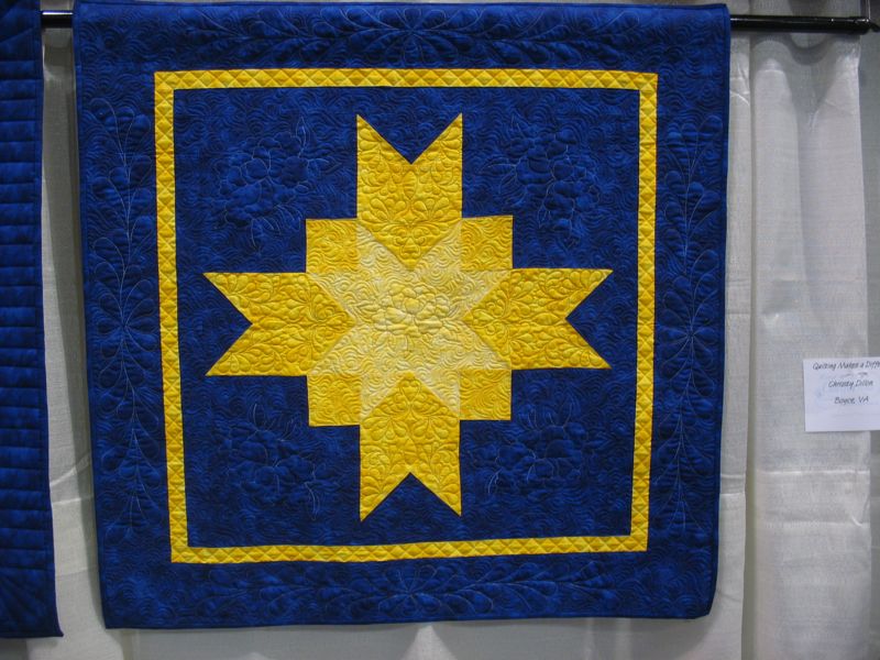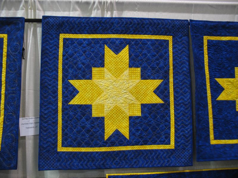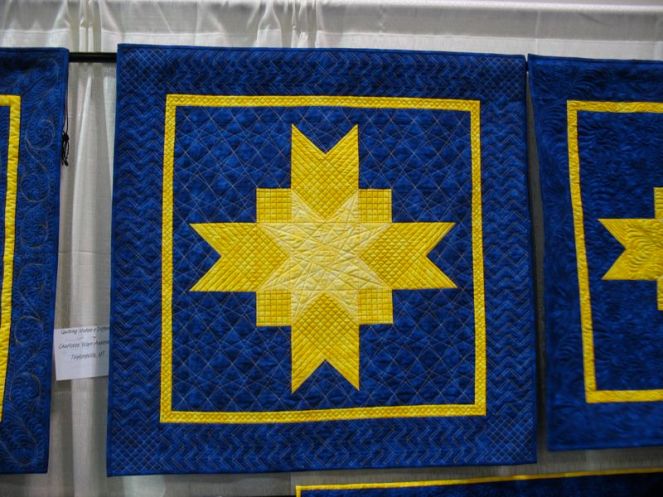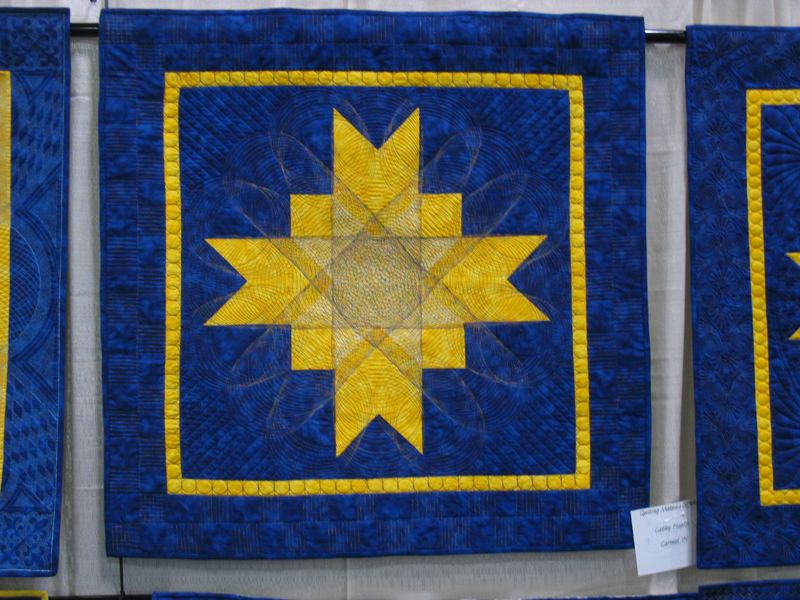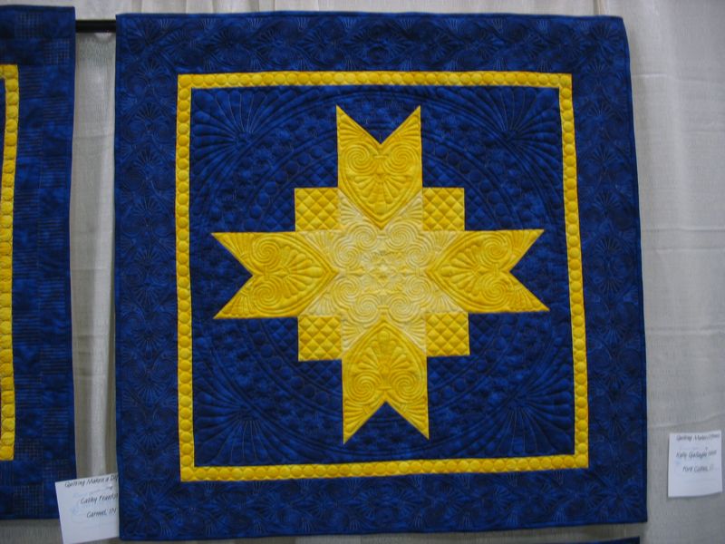 But, can I just say that this is a bit over the top?  That the machine quilting obscures the piecing design?  I get that it’s supposed to–I’m not that dense (well, at least not this morning).  But I always think a fine piece of art should harmonize on some level, and in cases where there isn’t enough quilting (I’ve done those quilts) or too much quilting (like the sample above), I think the quilt is not balanced.