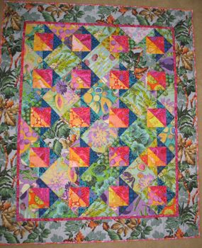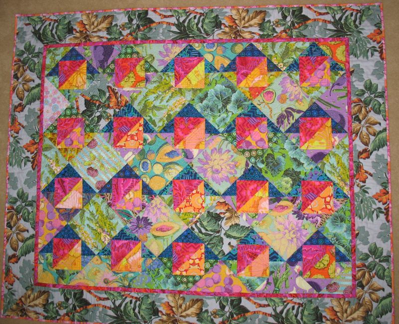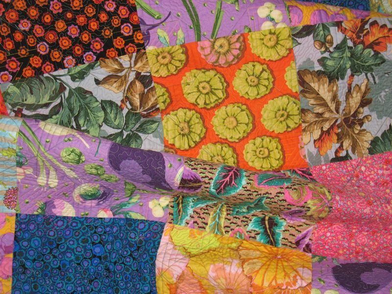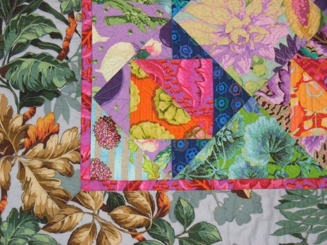 I was drawn to not only the Kaffe Fassett fabrics (rich in coloration and detail) but also those of designer Martha Negley and Phillip Jacobs (who designed that border).  I loved making this quilt, but it did take me three and a half years from inception to this stage–awaiting its label on the back.