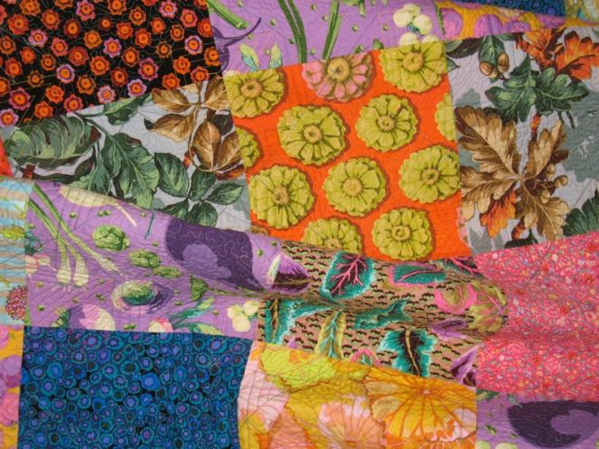 So, today, here is All Is Safely Gathered In, a quilt about sowing and harvesting.  I began this three years ago, trying to work with an original block I’d drafted–simple in design but it carried a nice big punch with those new large-scale prints that we were all investigating.  How to make them work?  Place them right up against each other in nice big squares and shapes–let that fabric shine. When I was casting about for a name, I talked it over with my husband.  How about something about harvest? he asked, and the phrase from a favorite hymn jumped right out at me.  When I was that young overwhelmed mother, I could think of nothing more satisfying than walking around the house at night, the last child in bed, the open book fallen to the floor, the night-light casting its golden glow on the cheeks and hair of these children who kept me so busy during the day.  I fell in love with them all over again, storing up these feelings of satisfaction every night against the onslaught of the day.  And now, many many years later those children walk their houses at night, picking up the books, bending over to plant a kiss on their children’s soft cheeks.