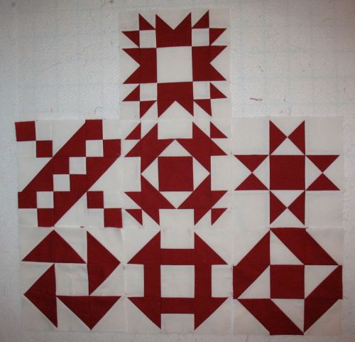 The Red/White Challenge finished ahead of schedule!  Here they all are, with my block on the top.  I have them up on the pin wall, just percolating there as I think very sweet thoughts about the women who took a chance on me and my quirky idea.  September 1st is the deadline for the Temecula Quilt Company’s “quilt show” and I want to have something new to add.