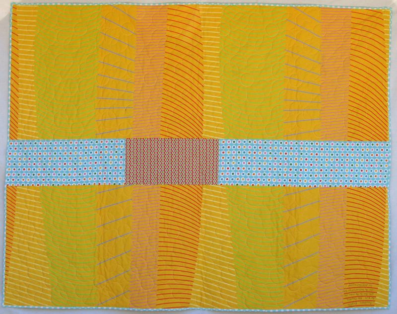 Love the Marimekko fabric on the back, punctuated by a strip of the the Anne Kelle flowers.  Alas, our Crate and Barrel outlet has closed, so now if I want those fabrics, I need to travel an hour and half–instead the previous half-hour.  So I hoard my stash of these, but this quilt just called out for something sunny and bright.