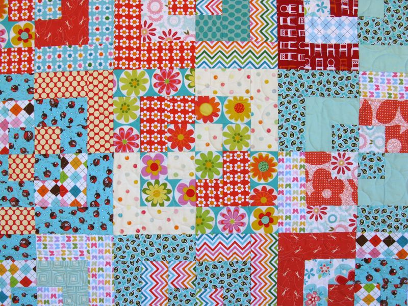 My favorite is the little Round Robin fabric with little round robins on it.  I also like the punched-up hugeness of those flowers in the middle.  Change in scale?  This quilt’s got it.  Change in color?  Yep, yep.  Change in value?  Not so much (all medium fabrics) so I threw in some lights and brights to keep the eye moving.