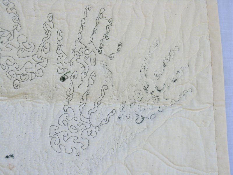 Then, for some strange reason, I decided to put it under my machine and quilt it. Maybe I did that because this idea of quilting the quilt yourself was an idea that was percolating around; back in the Olden Days (when we wore skins and cooked over an open fire and used cardboard templates and cut everything out by scissors) there was no machine quilting on your own machine. Either you hand-quilted it or you tied your quilt. That was it. Then the longarms started showing up, and then the idea came that you of course could do your own quilting. This quilt is a testament as to why sometimes you shouldn’t. Or you should take a class and get better. (Which I’ve tried to do.)