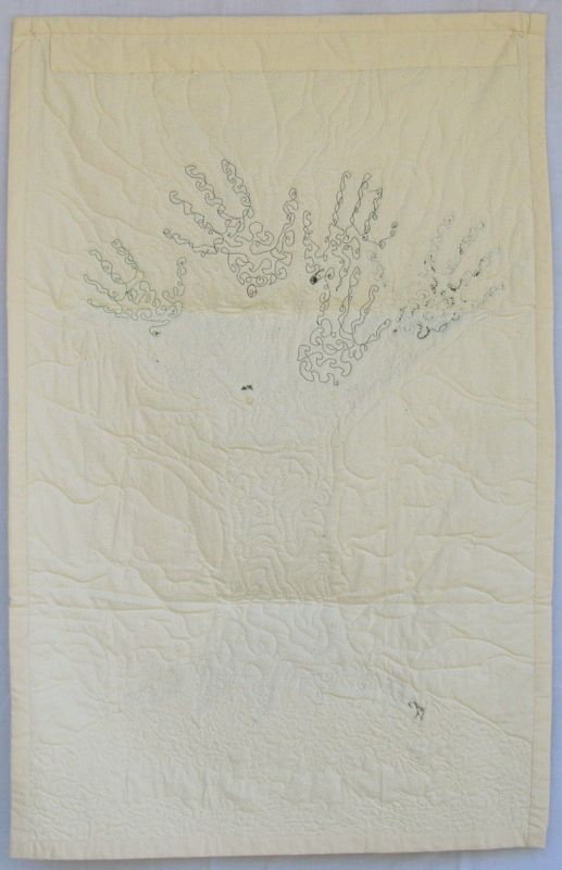 Don’t you just love all the loose bobbin stitches, the globs of thread that burped out on the back, the horrendously balanced thread tension? I give myself a little break because I WAS sewing through bunches of wallboard-glued-on-fused fabrics and that’s just about impossible.