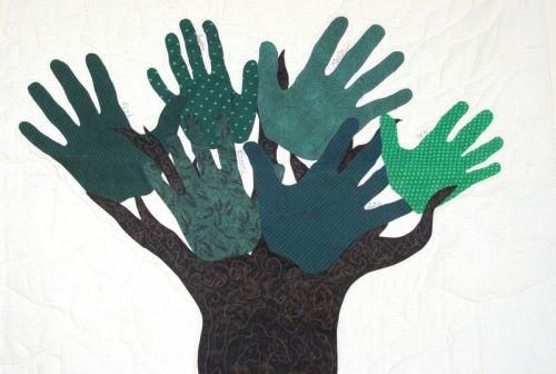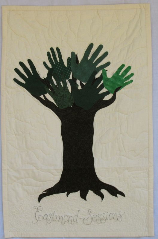 I cut out the tree, and then traced everyone’s hand for the leaves. I slabbed on them on to a tone-on-tone background fabric (which, thankfully we don’t have around much as the fabric can change colors turning more yellow–I think the newer ones are better).