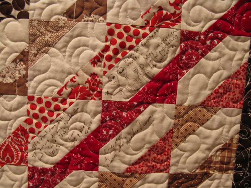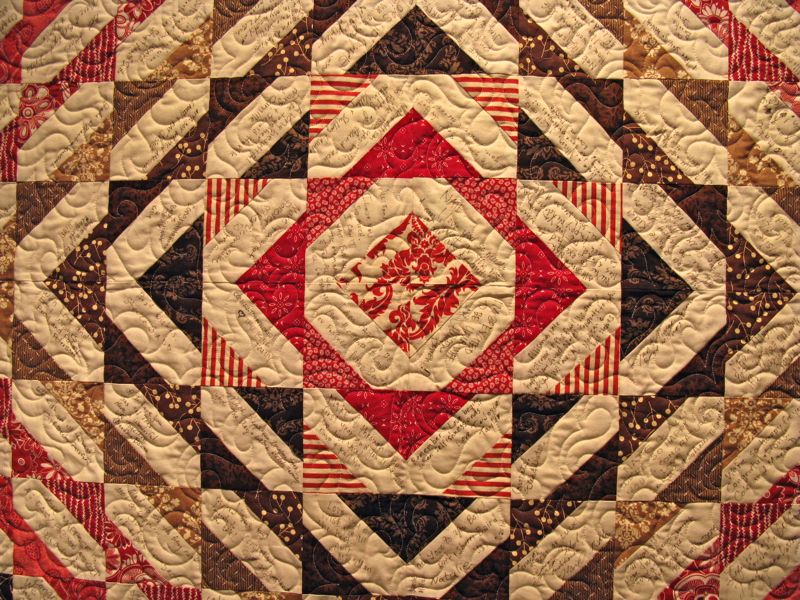Ann Bowen’s quilt delivers such a nice visual impact. Upon closer look, though, we noticed all these signatures and messages of good will. Then the title–The Perfect Beginning— finally clued us in: it was a quilt for a newlywed couple, perhaps signed at the reception by all the guests?